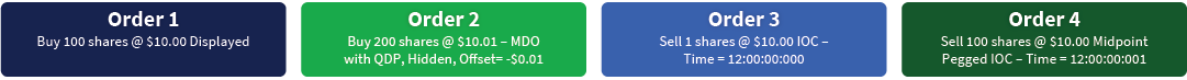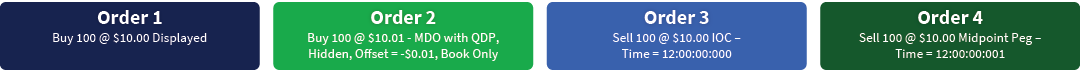 Order 2, which is an MDO to buy, is ranked at $9.99 non-displayed with discretion to the midpoint price of $10.005. When Order 3 is entered it will trade 100 shares with Order 1 at $10.00 triggering a QDP Active Period for Order 2. Order 4, which is a Midpoint Peg sell order, arrives while QDP is still active for Order 2 and posts to the book at 10.005. Order 2’s discretionary range is reinstated after the QDP Active Period expires and trades 100 at $10.005 with Order 4.