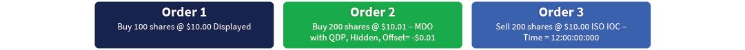 Order 2, which is an MDO to buy, is ranked at $9.99 non-displayed with discretion to the midpoint price of $10.005. When Order 3 is entered it would first trade 100 shares with Order 1 at $10.00. A QDP Active Period is then immediately enabled for Order 2 because of the execution of the EDGX Best Bid below one round lot. This restricts the ability for Order 2 to exercise discretion for two milliseconds, and prevents the execution of the remaining 100 shares of Order 3 within Order 2’s discretionary range. As a result, the remaining quantity of Order 3 would be cancelled.