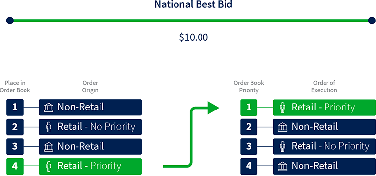 Displayed Retail Priority Orders will have priority ahead of all other available interest at a price level. Retail priority will not apply to fully hidden orders or discretionary ranges, but the reserve quantity of Retail Priority Orders will have priority ahead of the reserve quantity of other limit orders.